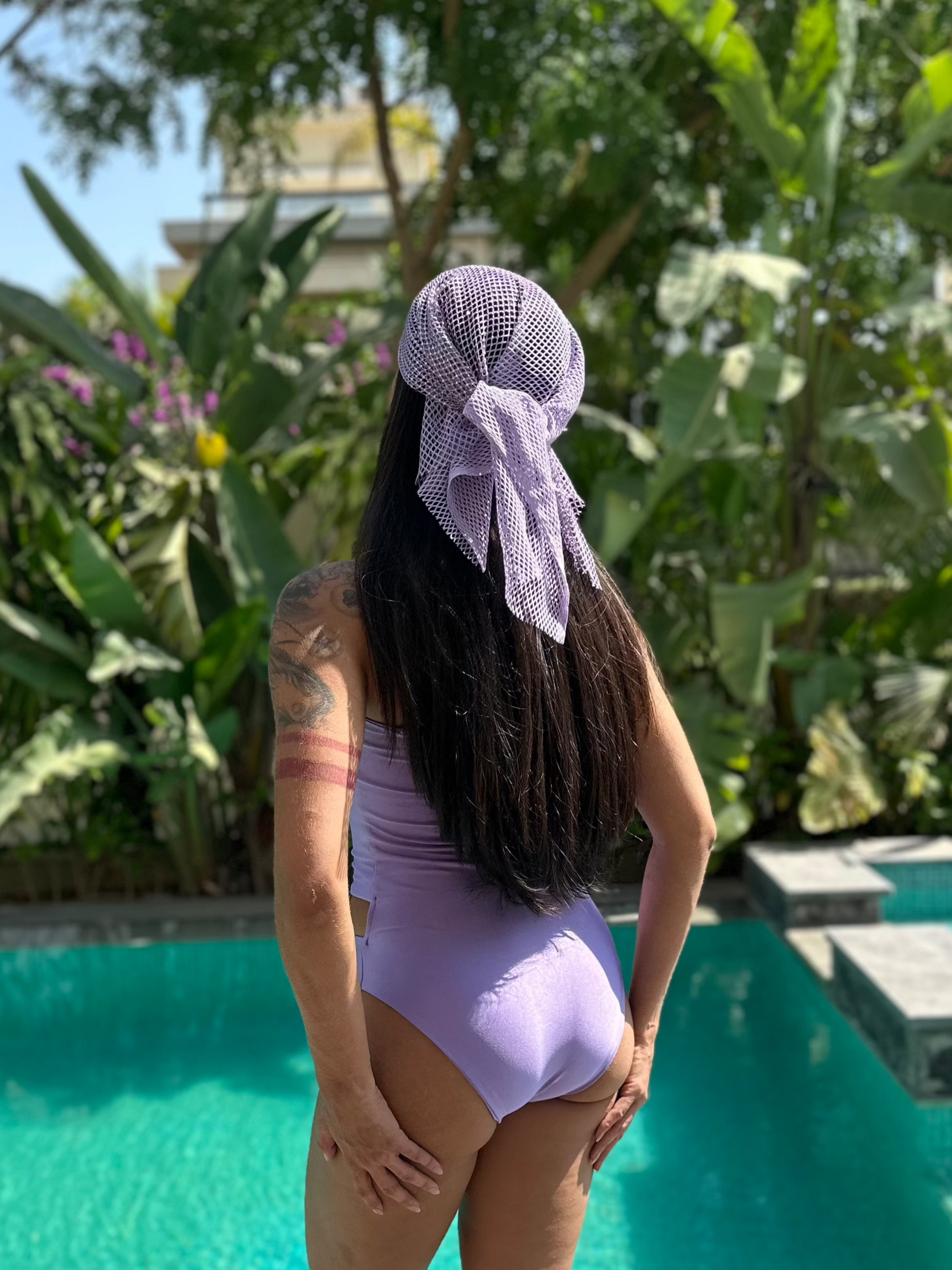 Purple one-piece with one of a kind cut-out that flatters your body.